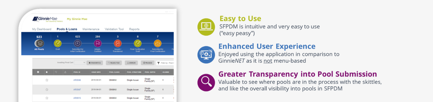 The Single Family Pool Delivery Module (SFPDM) is Ginnie Mae’s modernized application for the delivery of Single Family and Manufactured Housing issuance data. This application offers several new capabilities, including greater transparency into the progress of submitted pools through an intuitive and user-friendly interface.